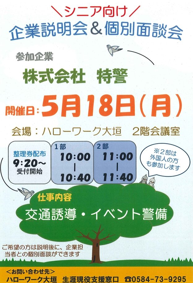 5月18日(月) 9時20分~11時40分までハローワーク大垣2階会議室で企業説明会を行います。